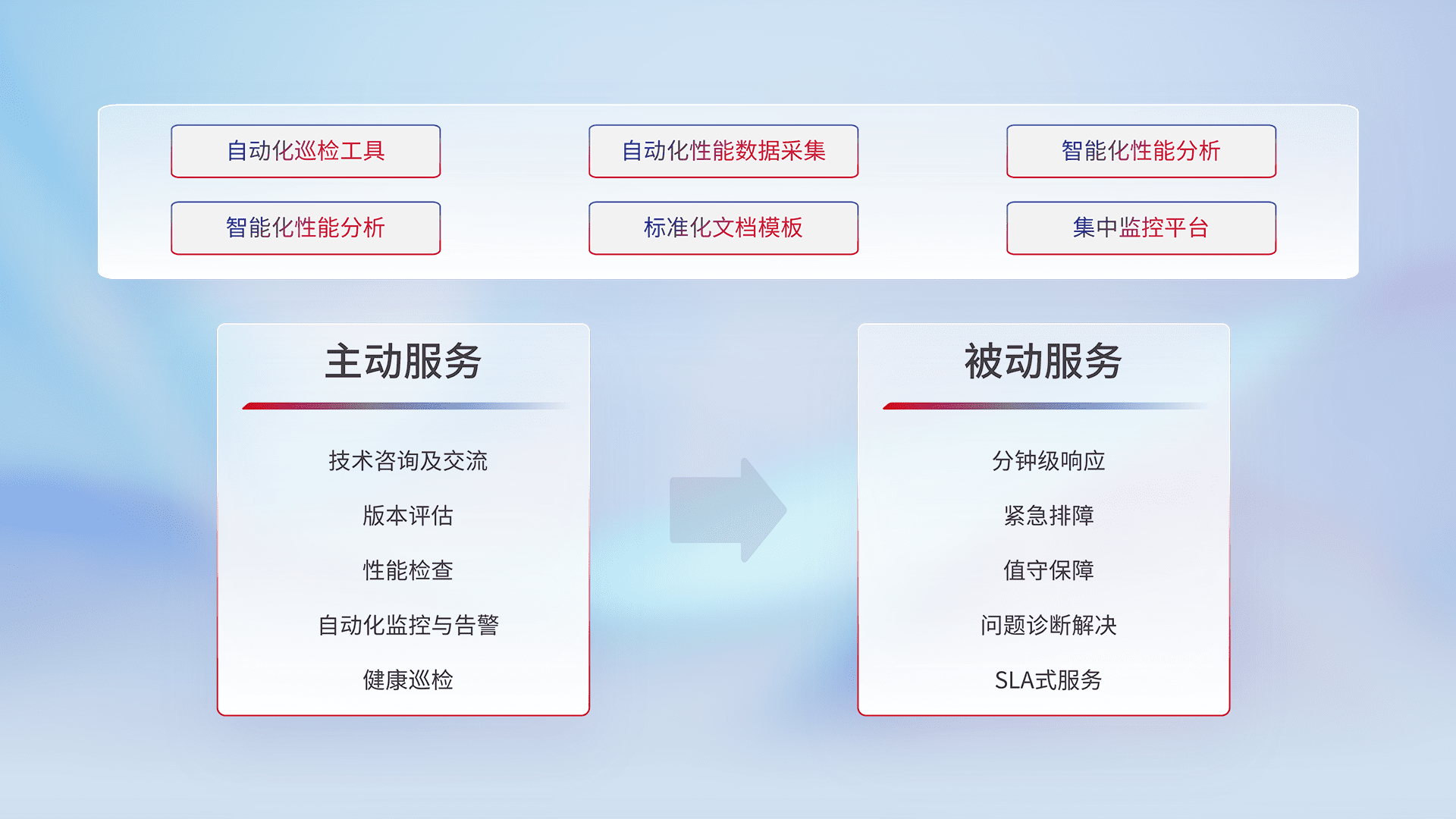 智能化工具和标准化文档,,,保障服务质量,,提供主动服务(包含技术咨询、、版本评估、、、性能检查、、自动化监控与告警、、、健康巡检)和被动服务包含(分钟级响应、、、、紧急排障、、值守保障、、、、问题诊断解决、、SLA服务)。。